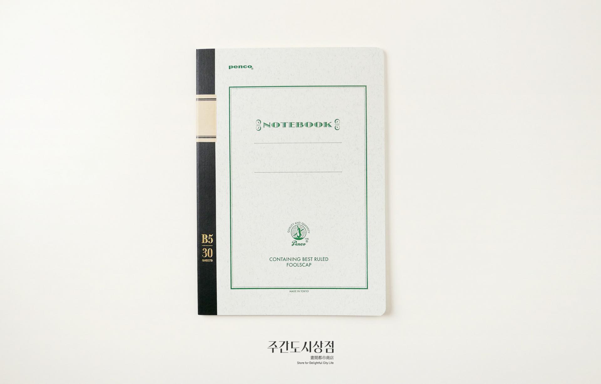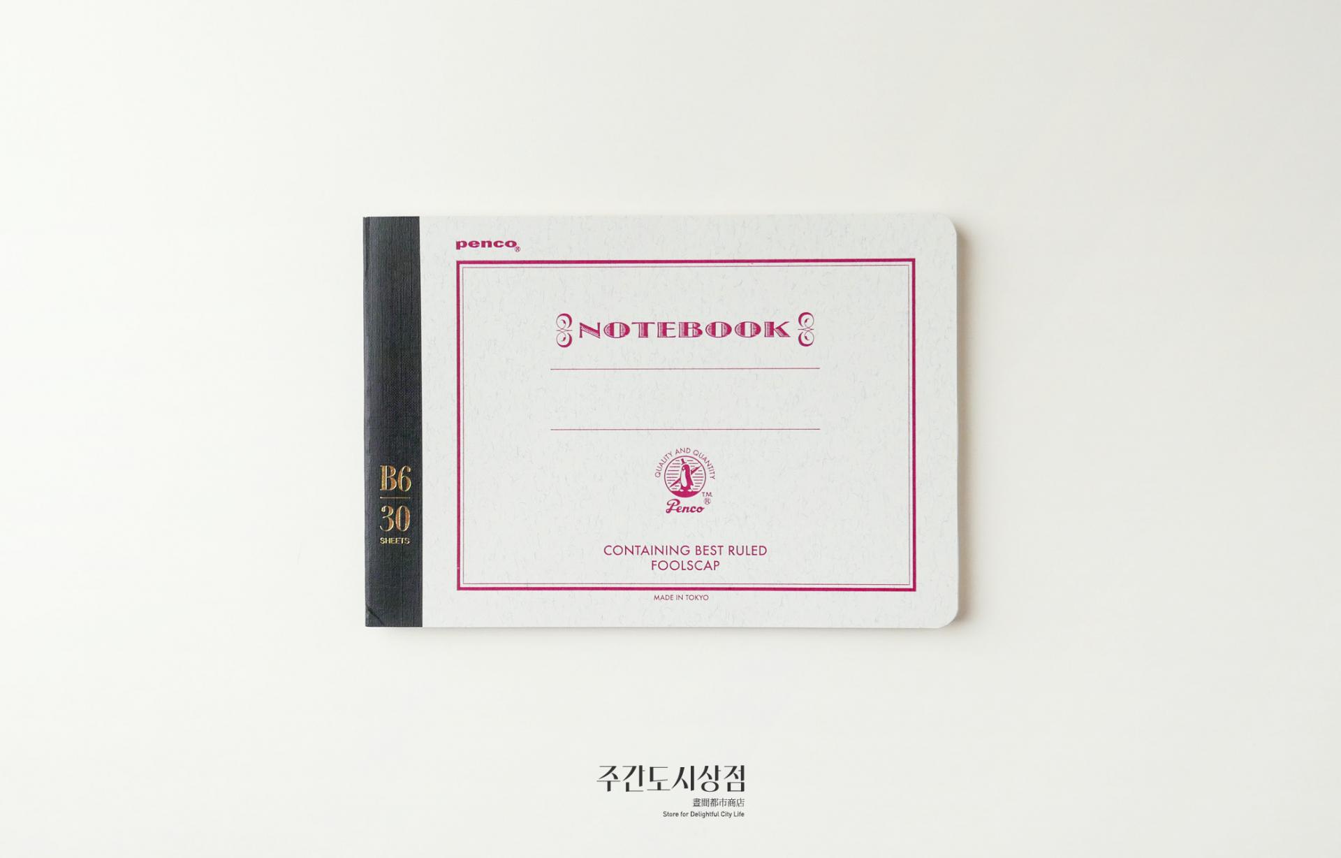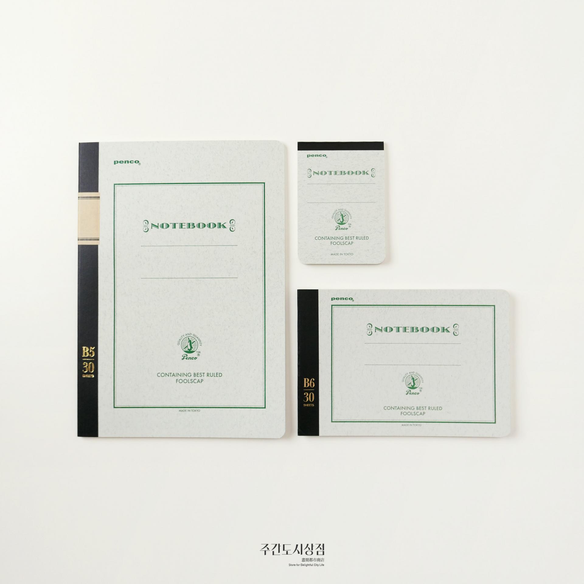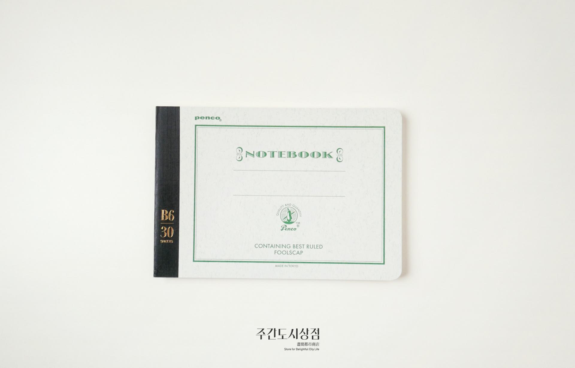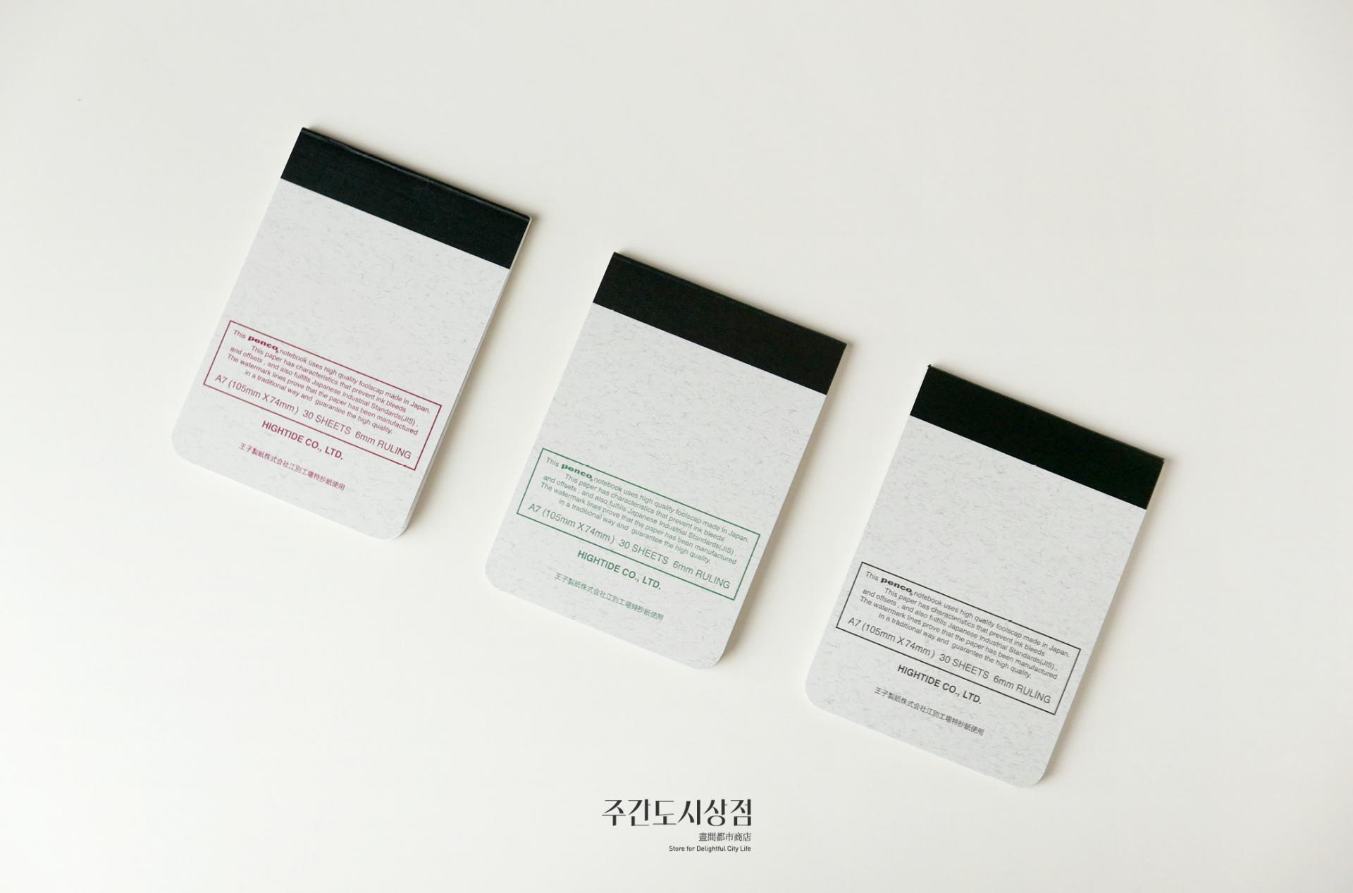 펜코의 색을 입힌 전통적인 공책이에요. 총 30장(60페이지)로 구성되어 있는 세 가지 크기로 구성되어 있어요. 줄 간격 모두 7mm로, 라인에 수성 잉크가 사용되어서 만년필 사용에도 적합합니다.