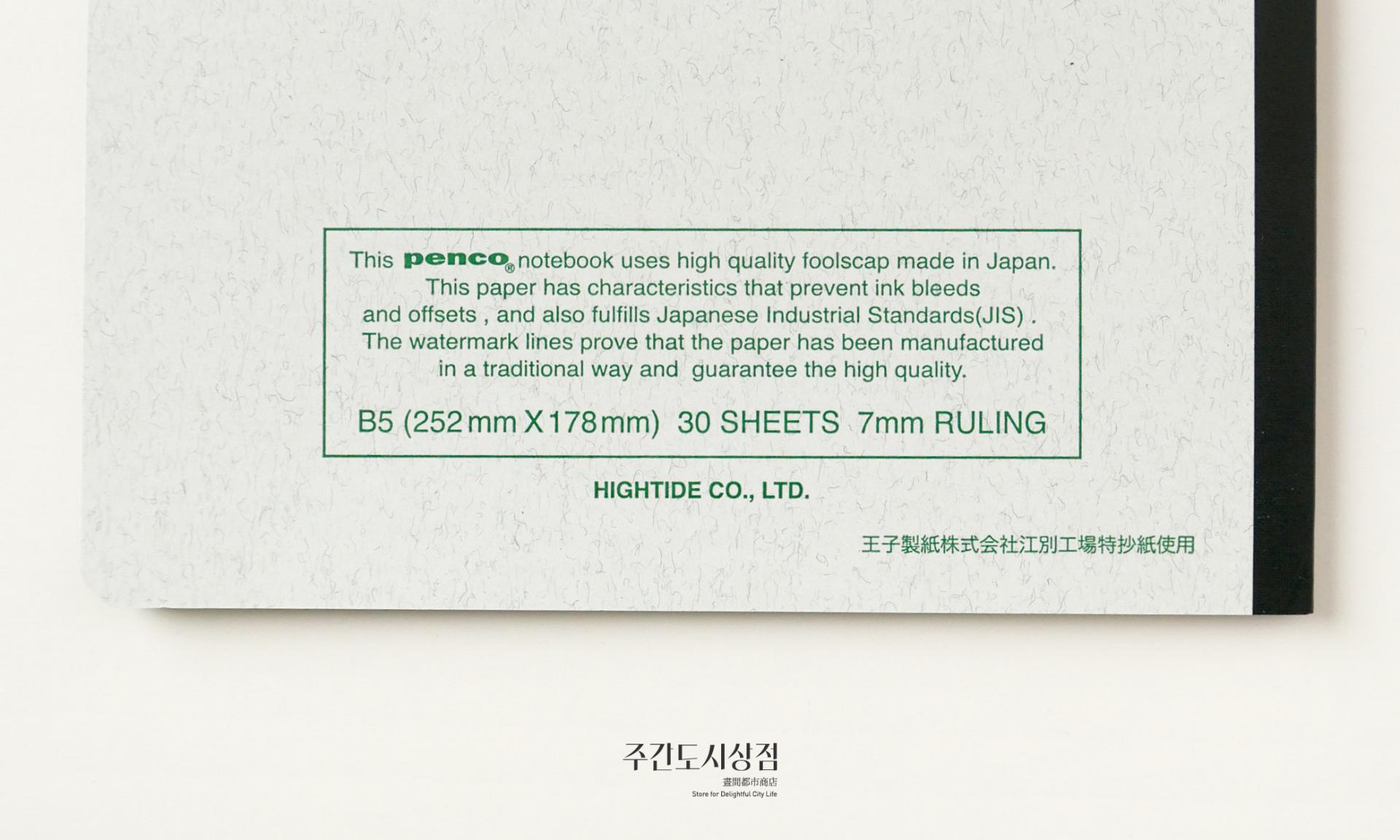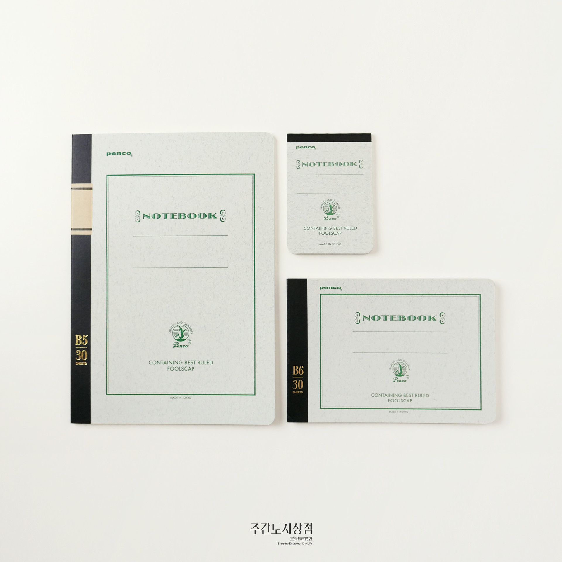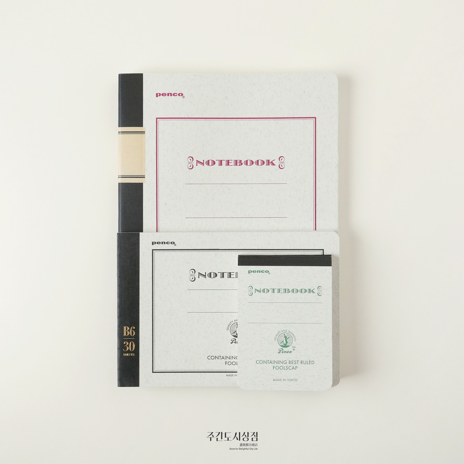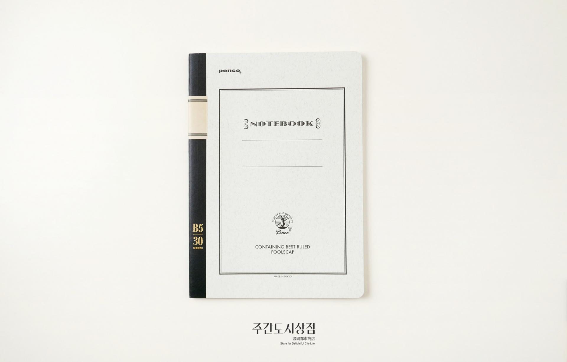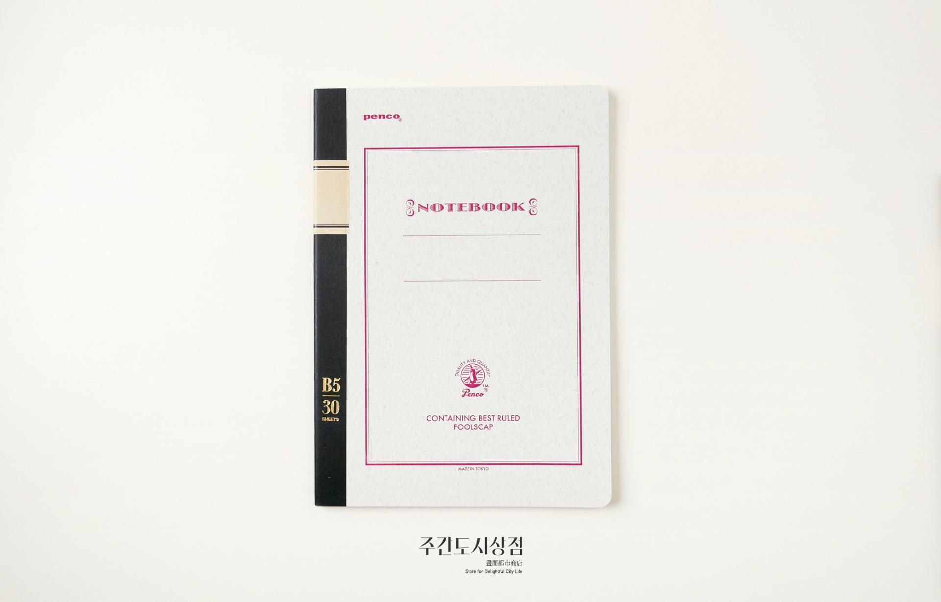 펜코의 색을 입힌 전통적인 공책이에요. 총 30장(60페이지)로 구성되어 있는 세 가지 크기로 구성되어 있어요. 줄 간격 모두 7mm로, 라인에 수성 잉크가 사용되어서 만년필 사용에도 적합합니다.