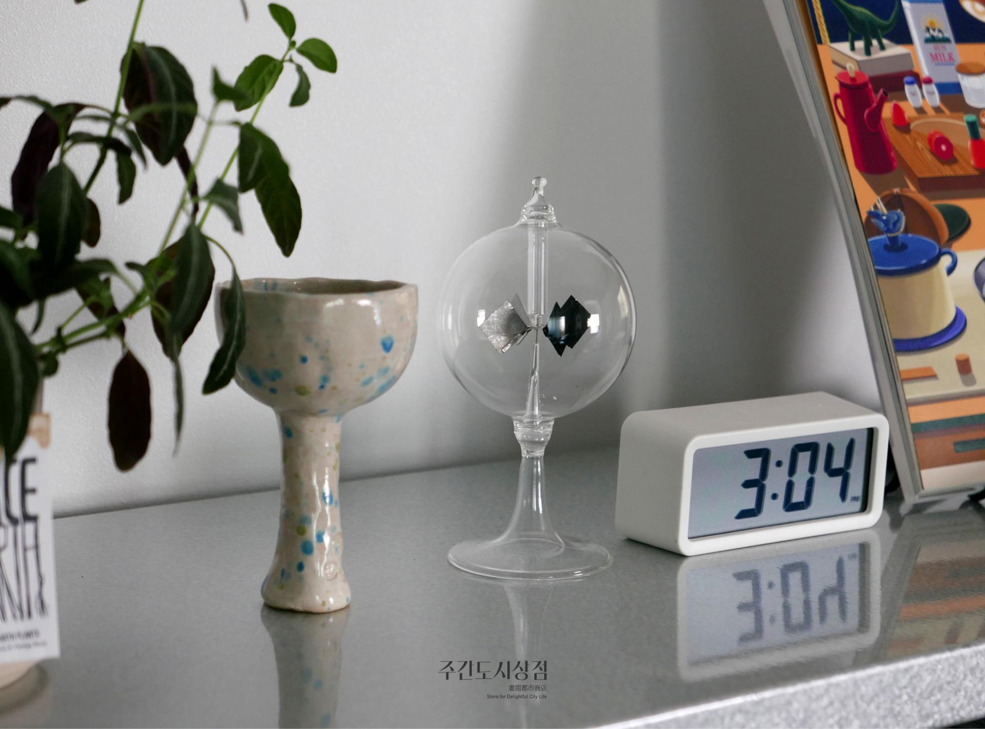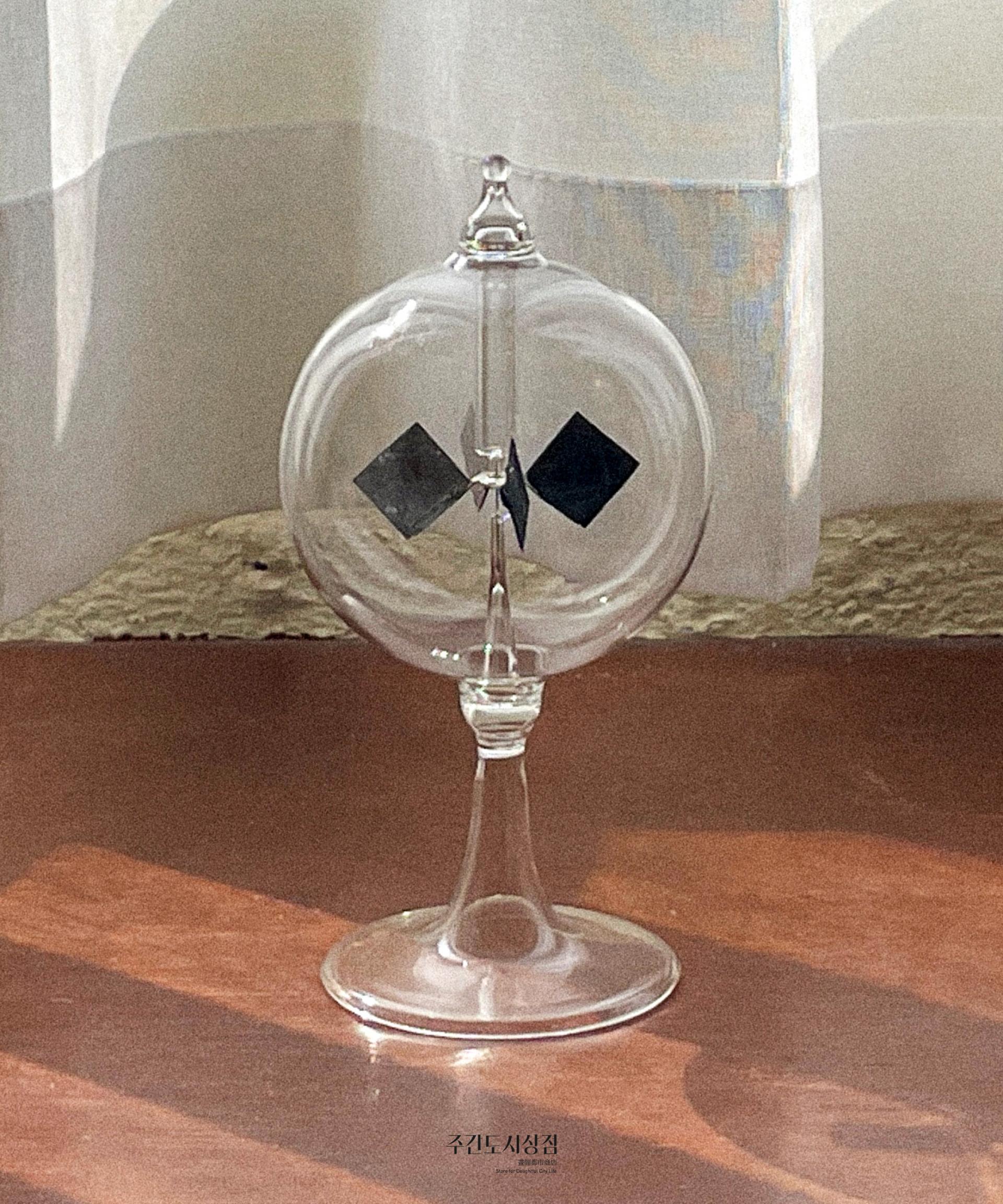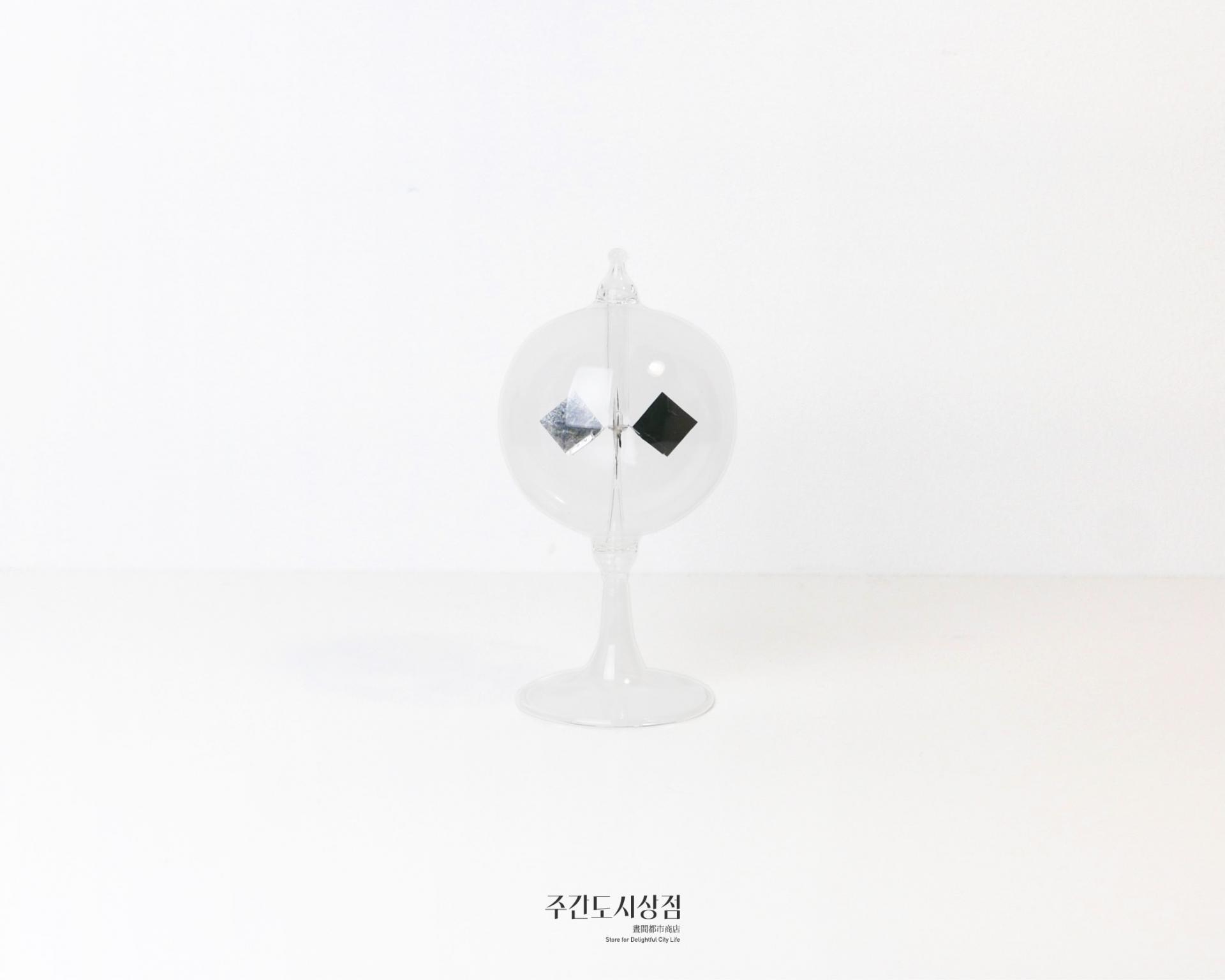 유리 내에 있는 날개의 한쪽 면에 붙은 검은 물체가 적외선을 포함한 빛에 반응하여 돌아가는 인테리어 오브제입니다. 라디오미터는 빛의 강도와 광원에 따라 회전하는 속도가 달라지니 빛이 들어오는 창가나 백열등 근처에 두고 날개가 움직이는 모습을 즐겨보세요.