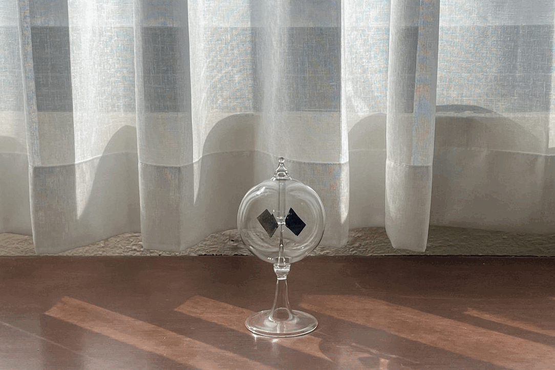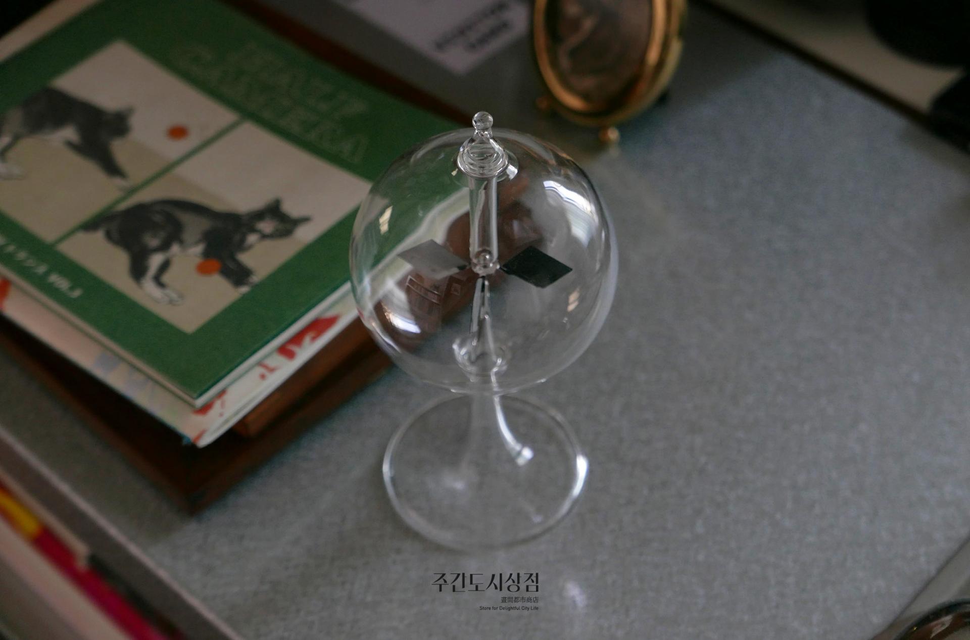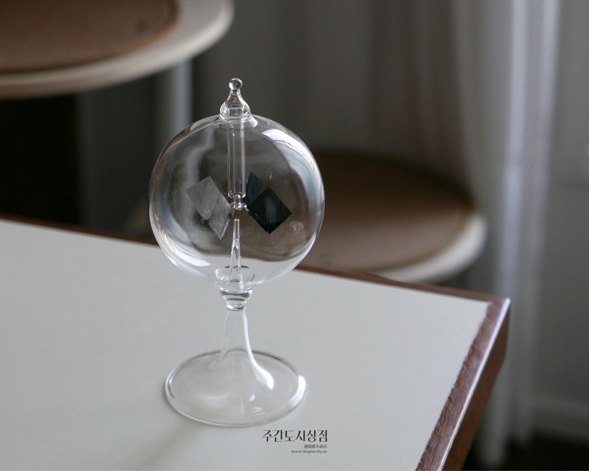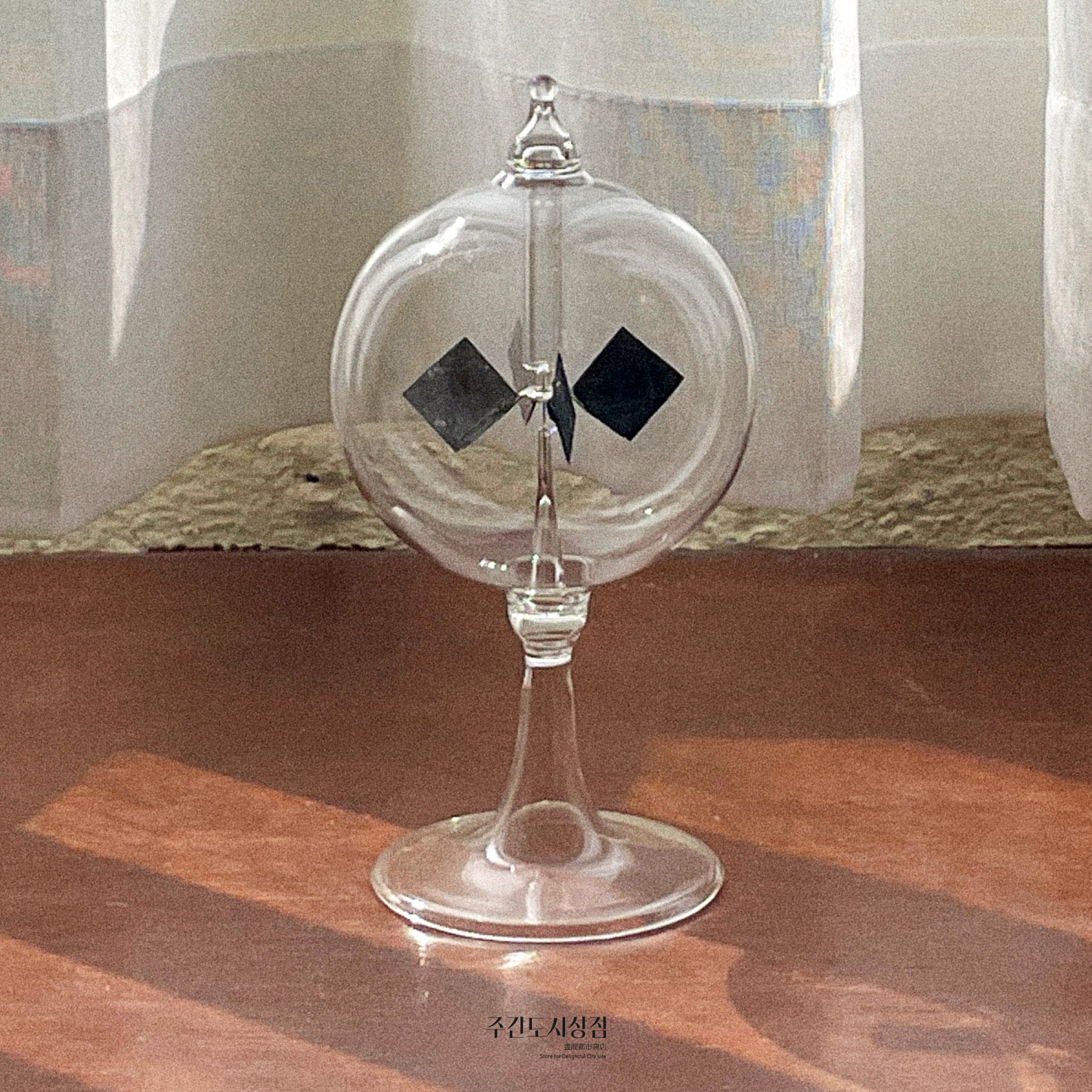 유리 내에 있는 날개의 한쪽 면에 붙은 검은 물체가 적외선을 포함한 빛에 반응하여 돌아가는 인테리어 오브제입니다. 라디오미터는 빛의 강도와 광원에 따라 회전하는 속도가 달라지니 빛이 들어오는 창가나 백열등 근처에 두고 날개가 움직이는 모습을 즐겨보세요.