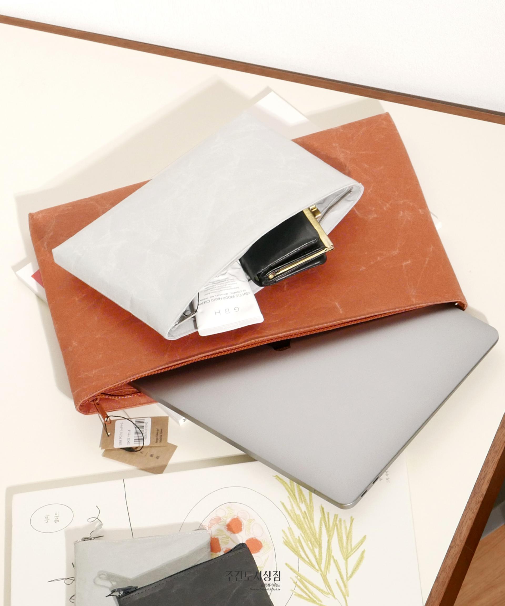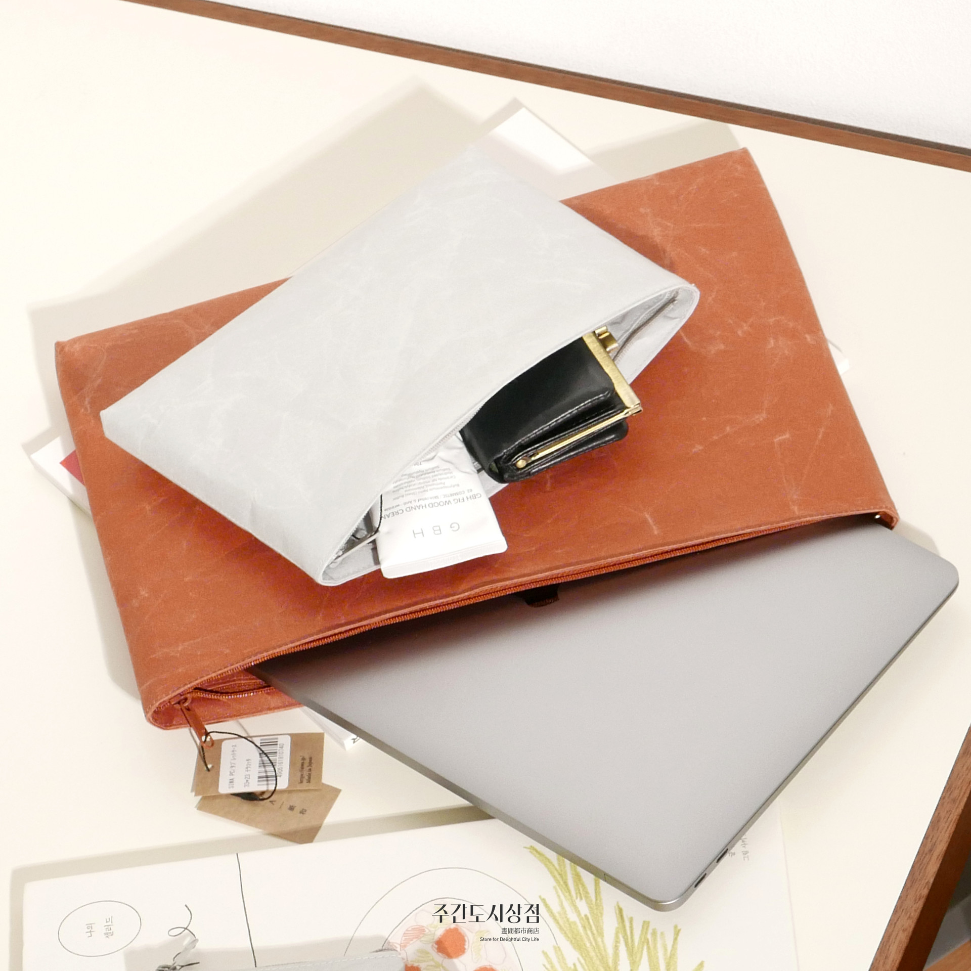 가방에 노트북이나 태블릿 PC를 넣을 때 상처로부터 지키기 위한 전용 케이스입니다. 맥북에어 및 맥북프로, 아이패드 프로12.9인치 등 13인치의 제품들까지 넣을 수 있는 사이즈로 A4 사이즈의 서류들도 수납할 수 있습니다. 무게는 63g밖에 안되는 가벼운 무게로 부담 없이 사용할 수 있습니다. 종이보다 강한 강도에 물에도 강한 소재인 naoron(나오론)으로 제작된 케이스라 편하게 어디든 들고 다닐 수 있습니다.