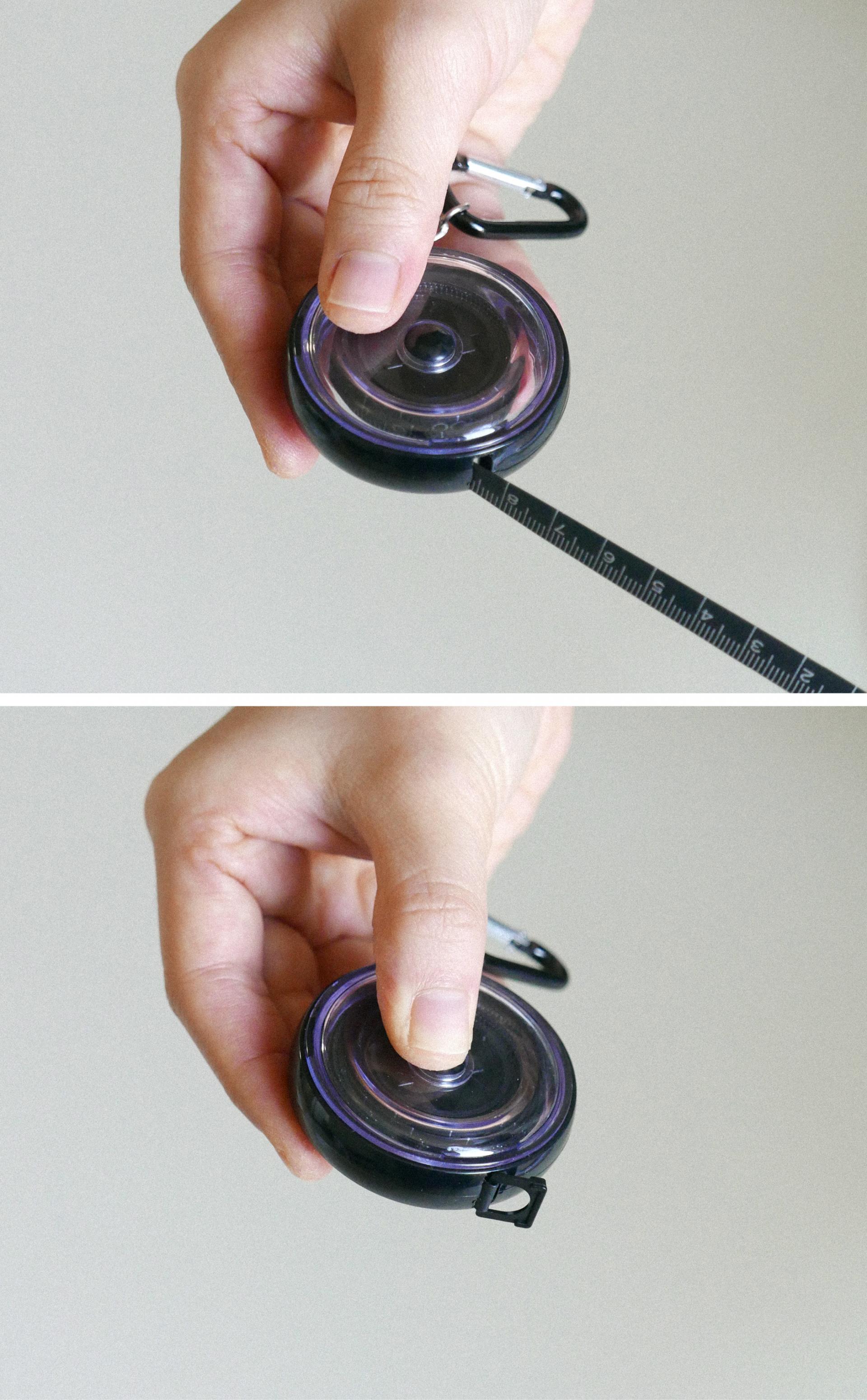 앞, 뒤 모두 눈금이 있는 심플한 줄자입니다. 총 150cm 길이로 줄자를 꺼내면 고정이 되었다가 본체 가운데 버튼을 누르면 줄자가 자동으로 들어가는 제품입니다.