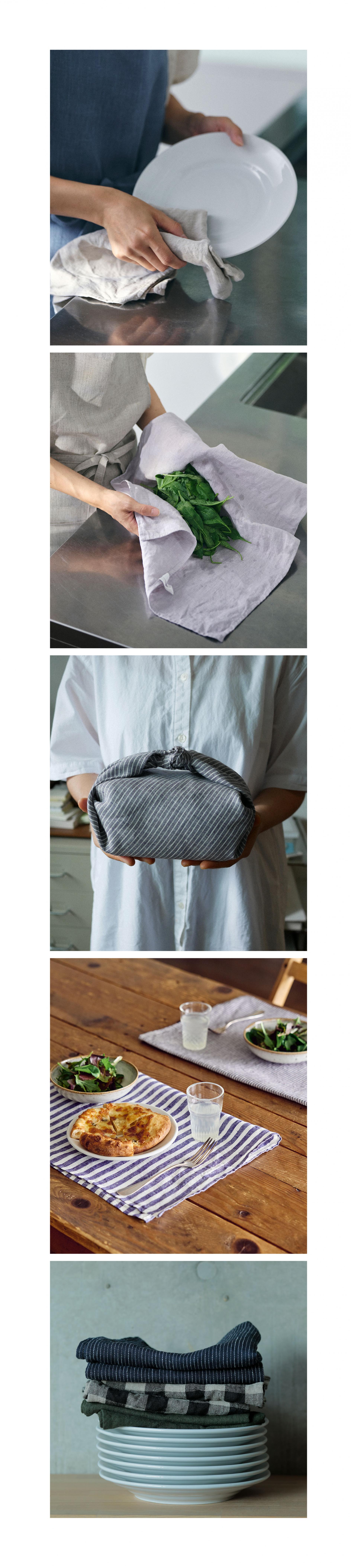 테이블 매트로 사용하거나, 식기를 건조할 때, 바구니의 안감으로, 음료의 보온, 반죽을 덮어두거나 흘린 것들을 치울 때 등 다양하게 사용이 가능합니다.