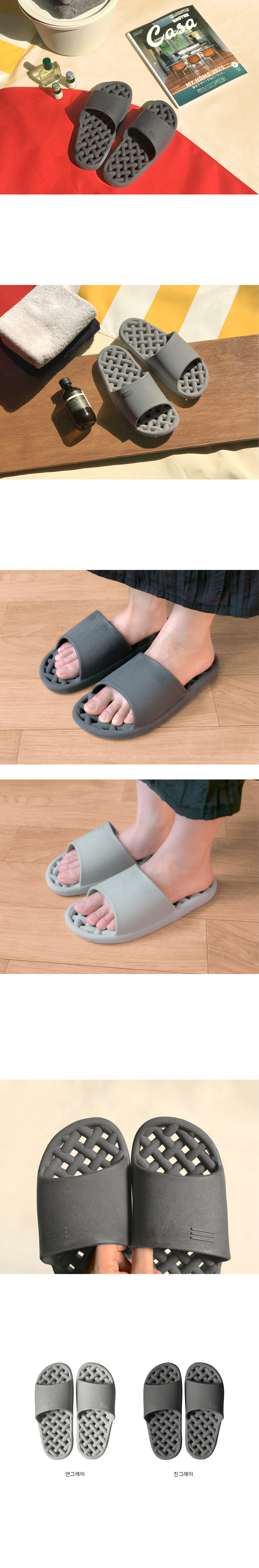 실용적이고 모던한 욕실화입니다. 톤 다운된 색상으로 어느 욕실에나 어울리고 물 빠짐이 좋아서 건조가 빠릅니다. 특수 처리 PVC 재질로 가볍고 미끄럽지 않으며 말랑말랑하여 착화감이 좋습니다.
