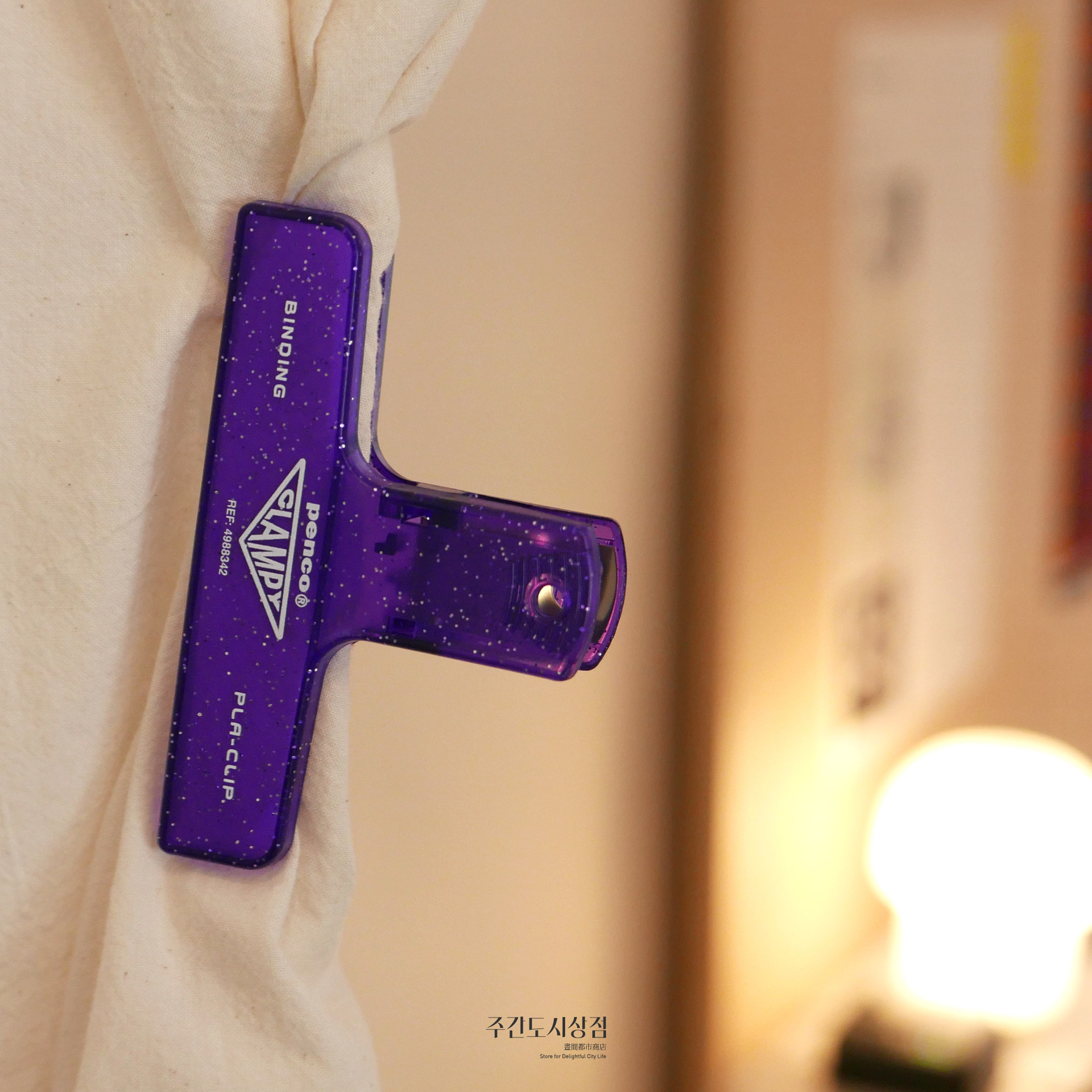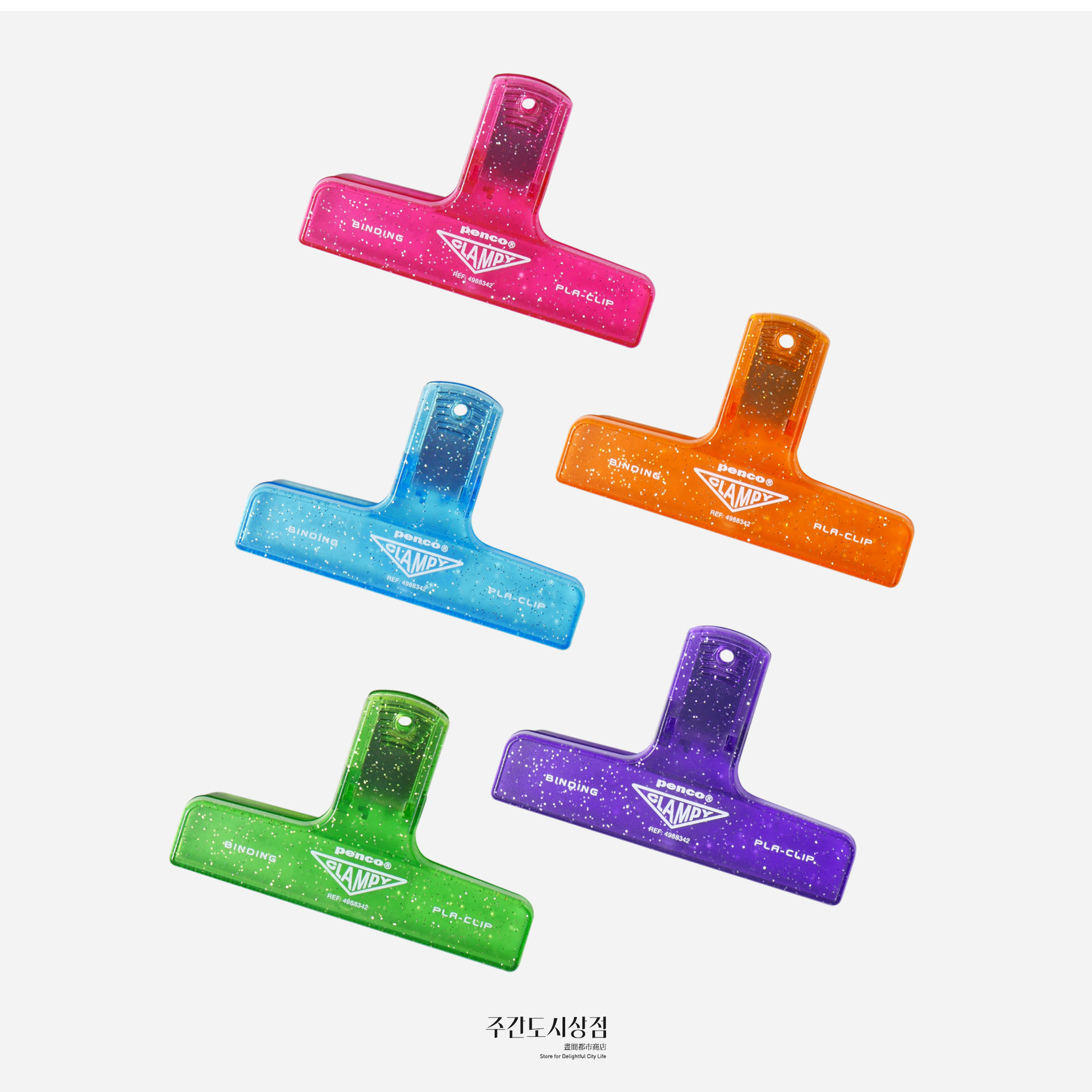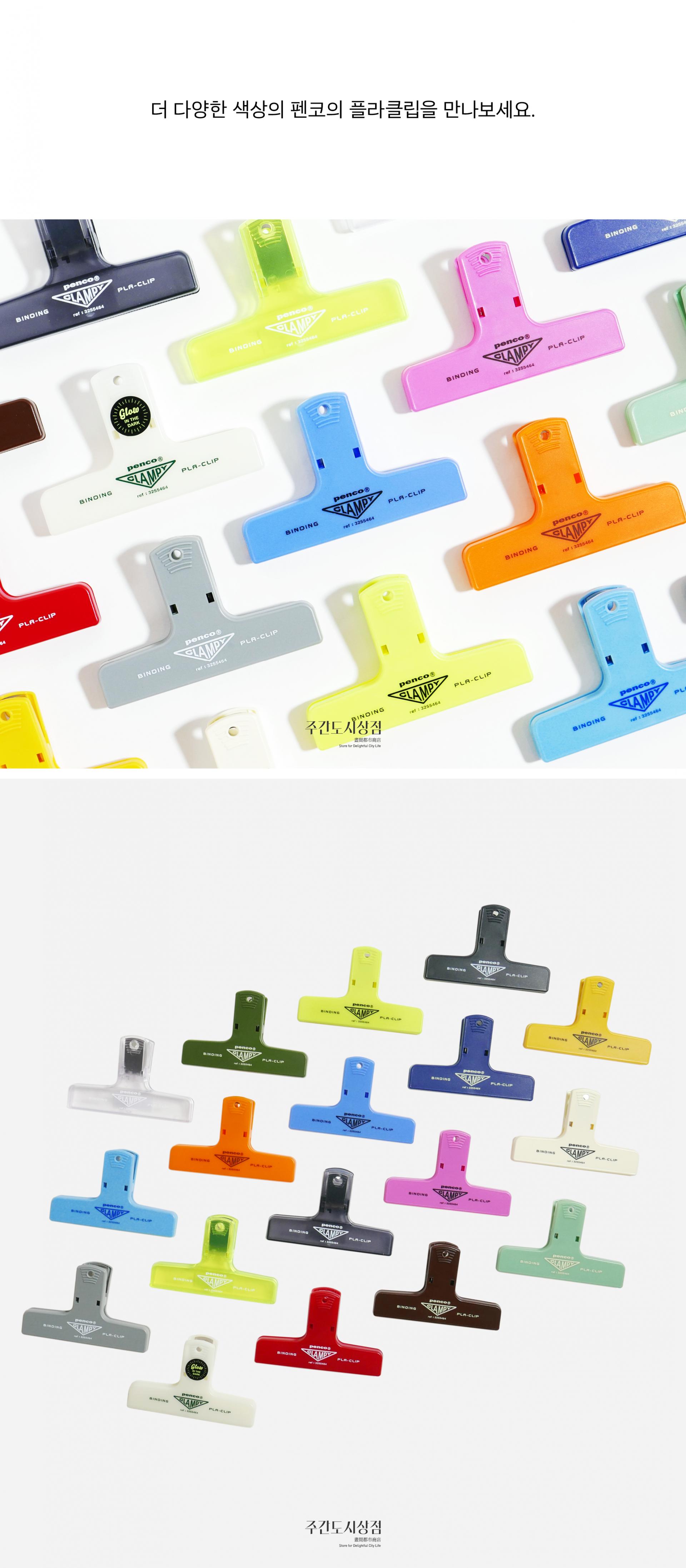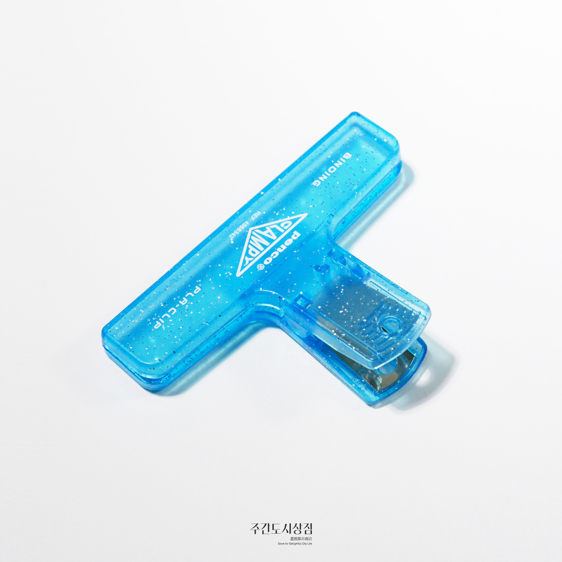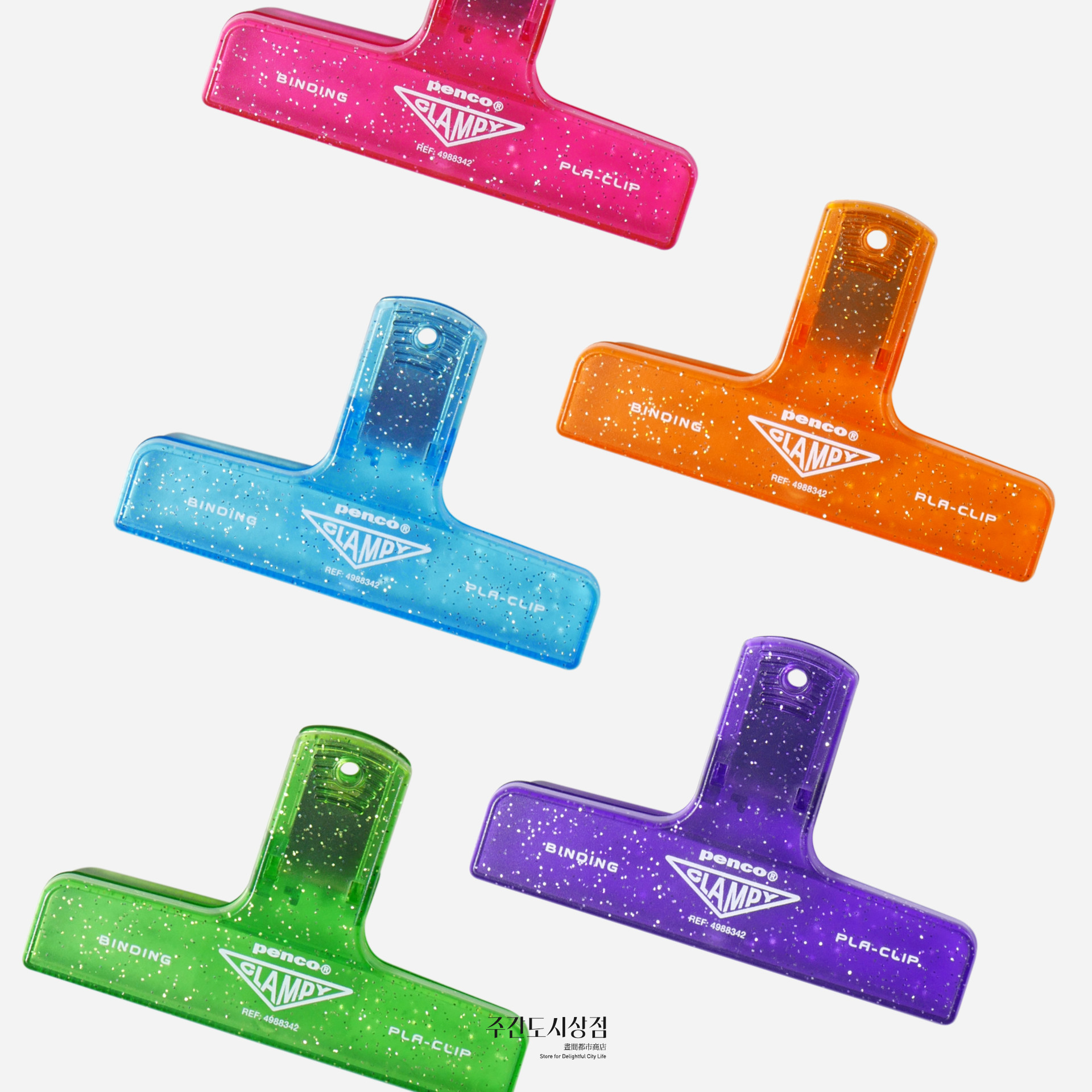 다양한 색상으로 나오는 펜코의 레트로 플라스틱 클립 시리즈 중 클리어 타입의 클립에 반짝이가 들어있는 시리즈입니다. 가볍지만 강하게 잡아줄 수 있는 제품으로 주방이나 사무실에서 사용하기 좋아요.